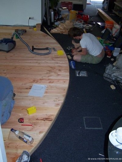 Die Vorderkante wird abgeschrägt. Die Mitte ist die Mitte der Leinwand und des Plasmas. Die Front wird noch mit Holz versehen.