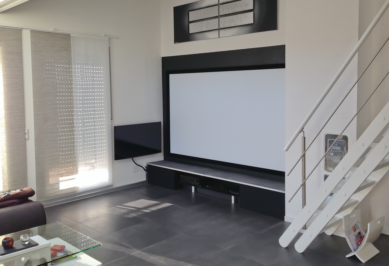 Die Kabelführung verläuft komplett verdeckt unter Putz und bedienbar ist die Anlage mit einer einzigen Fernbedienung. Ein Knopfdruck genügt und das Wohnzimmer verwandelt sich in ein beeindruckendes Heimkino. So macht Heimkino richtig Spaß!