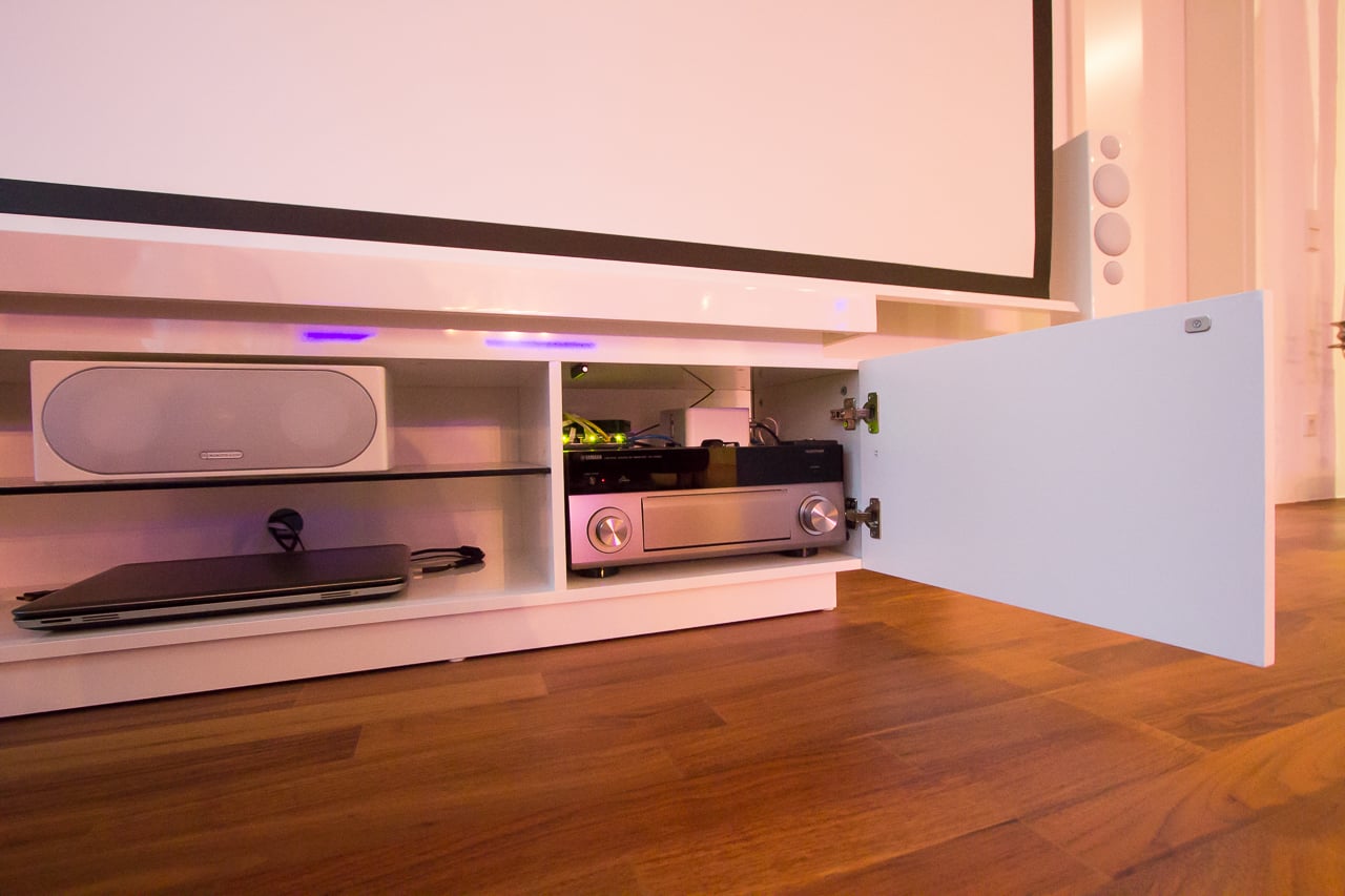 Das Highlight ist aber die Deckeneinbau-Leinwand von VnX InCeiling. Eine Heimkino Leinwand über 3 Meter Bilddiagonale, die auf Knopfdruck aus der Decke fährt! Bei dieser Bildgröße macht ein Kinoabend im eigenen Wohnzimmer richtig Spaß!
