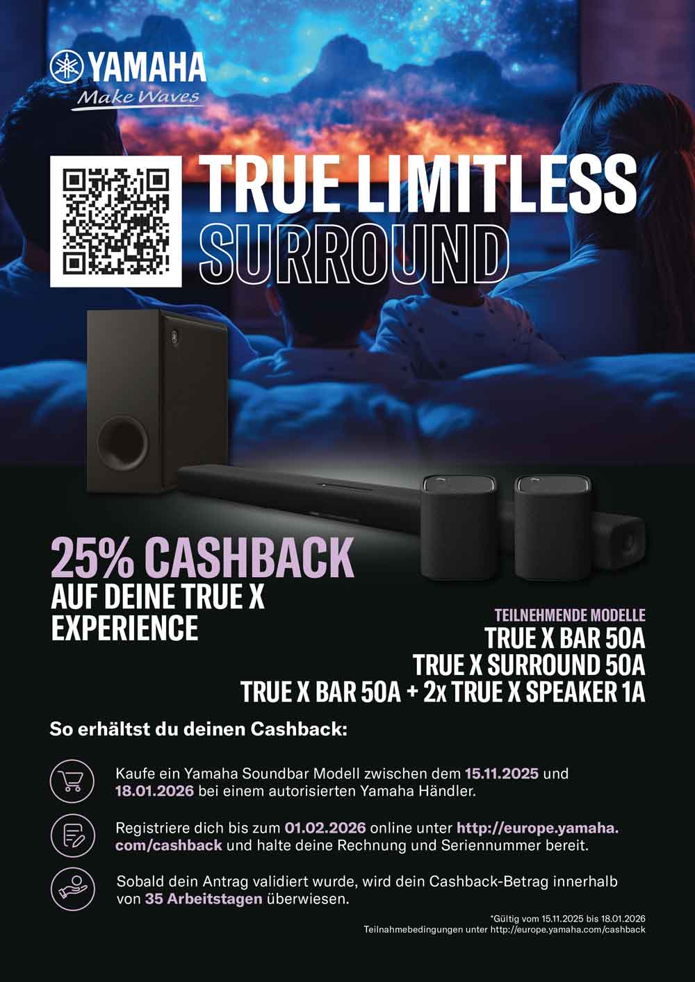 Jetzt das Yamaha True X Surround 50A Komplett Set kaufen und 25 Prozent Cashback von Yamaha zurück bekommen! Die Aktion läuft bis zum 18.01. Mehr Infos im Produkt.